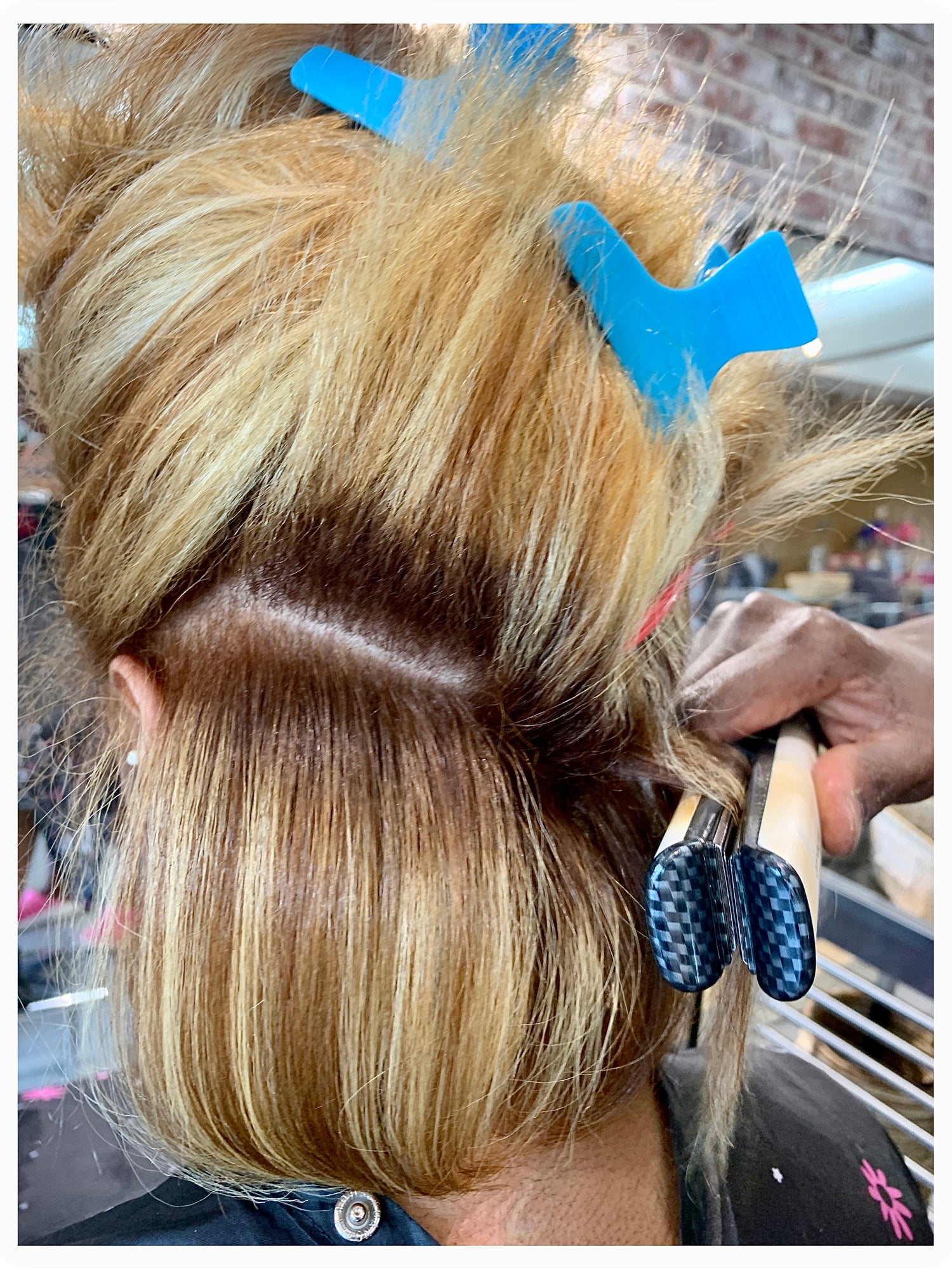 En fonction de la nature du cheveu qui sera défrisé, nous suivrons un procédé précis afin de protéger le cuir chevelu, respecter l’intégrité du cheveu et obtenir l’effet escompté : Des cheveux lissés, satinés et lumineux. La pose du défrisage s’accompagne de la pose de deux soins destinés à prévenir des lésions capillaires et réparer le cheveu.